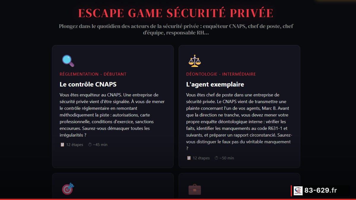 Un escape game gratuit sur la sécurité privée. 4 parcours, 48 énigmes, des situations réelles vérifiées sur Légifrance. Agents, étudiants BTS MOS, dirigeants : testez-vous autrement. Sans par-cœur. Sans PDF de 800 pages.